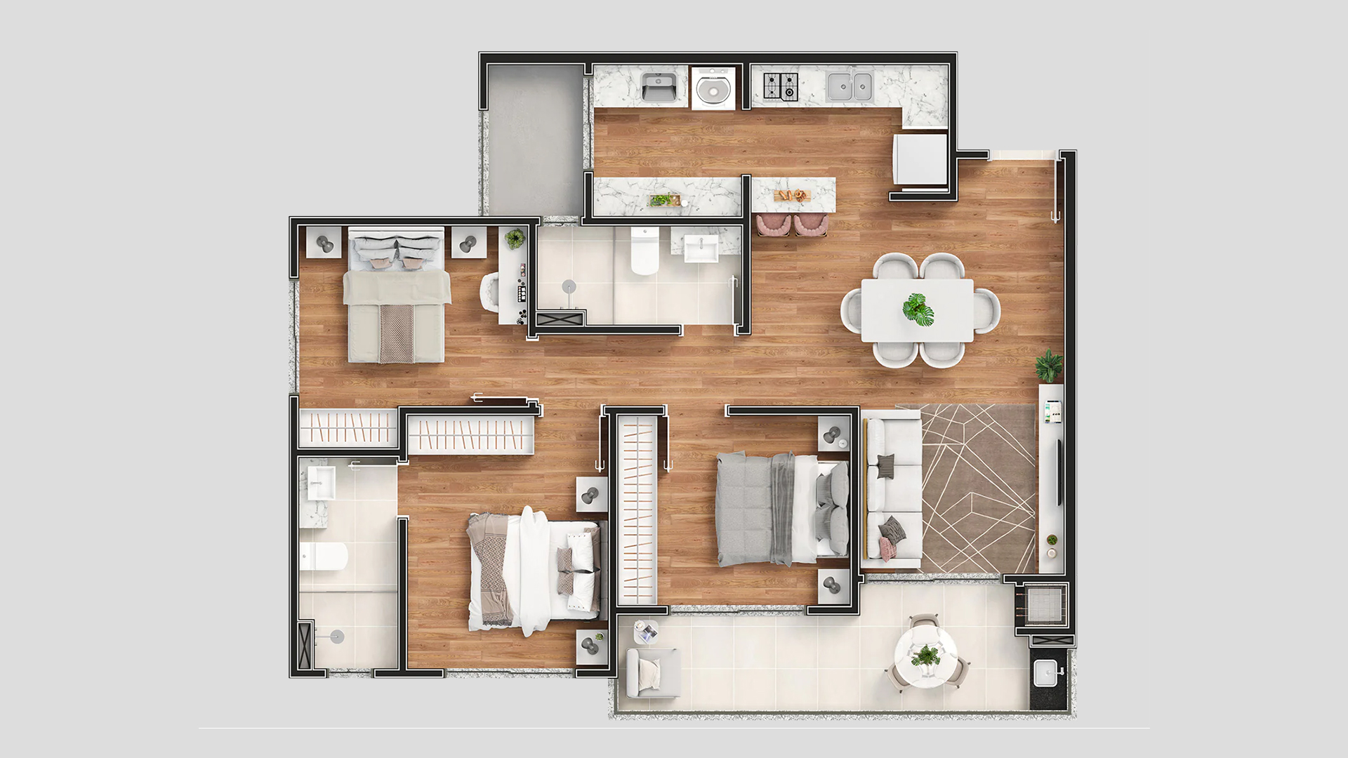 • Piso porcelanato em áreas sociais e banheiros