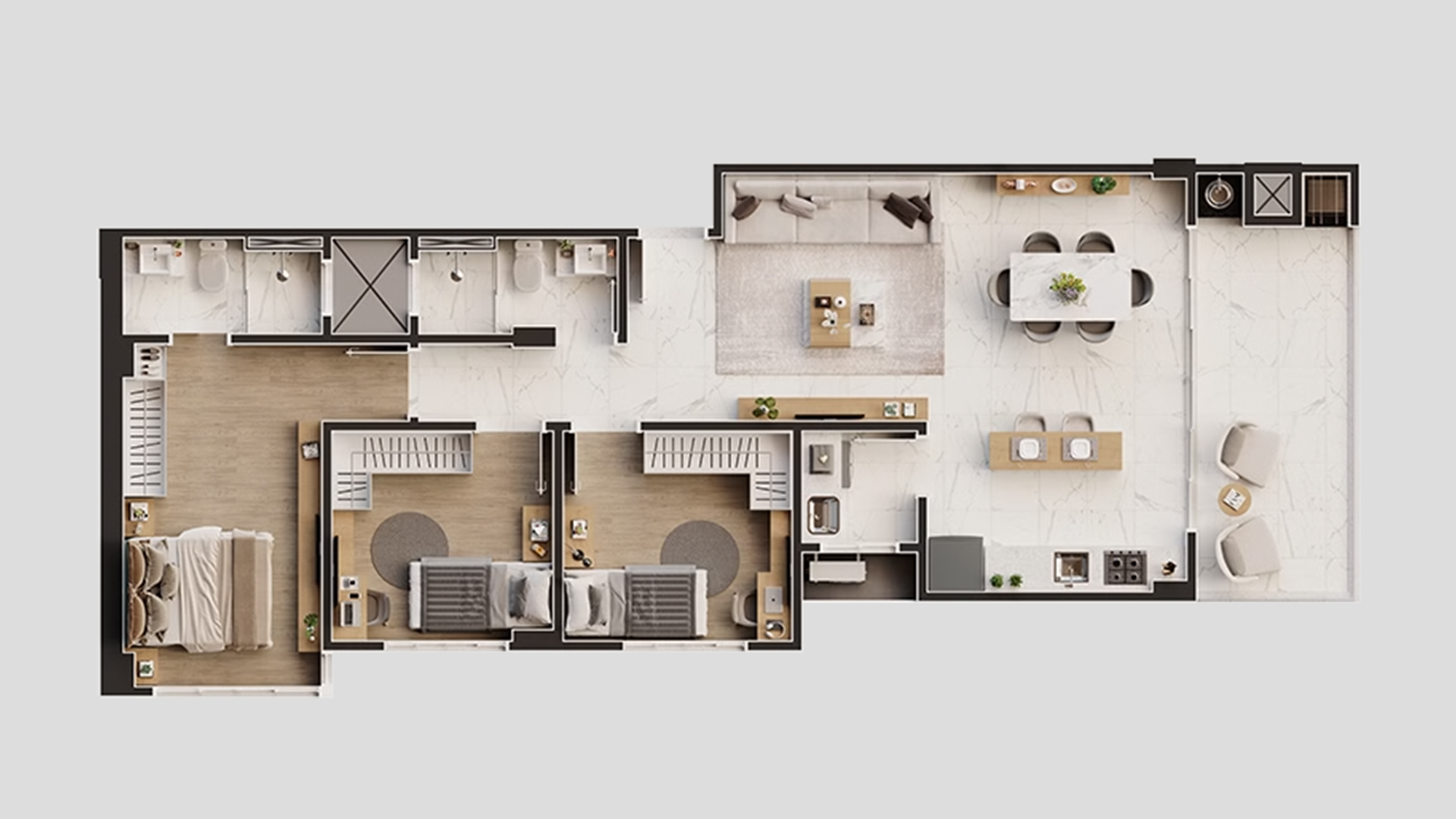 • Piso porcelanato em áreas sociais e banheiros